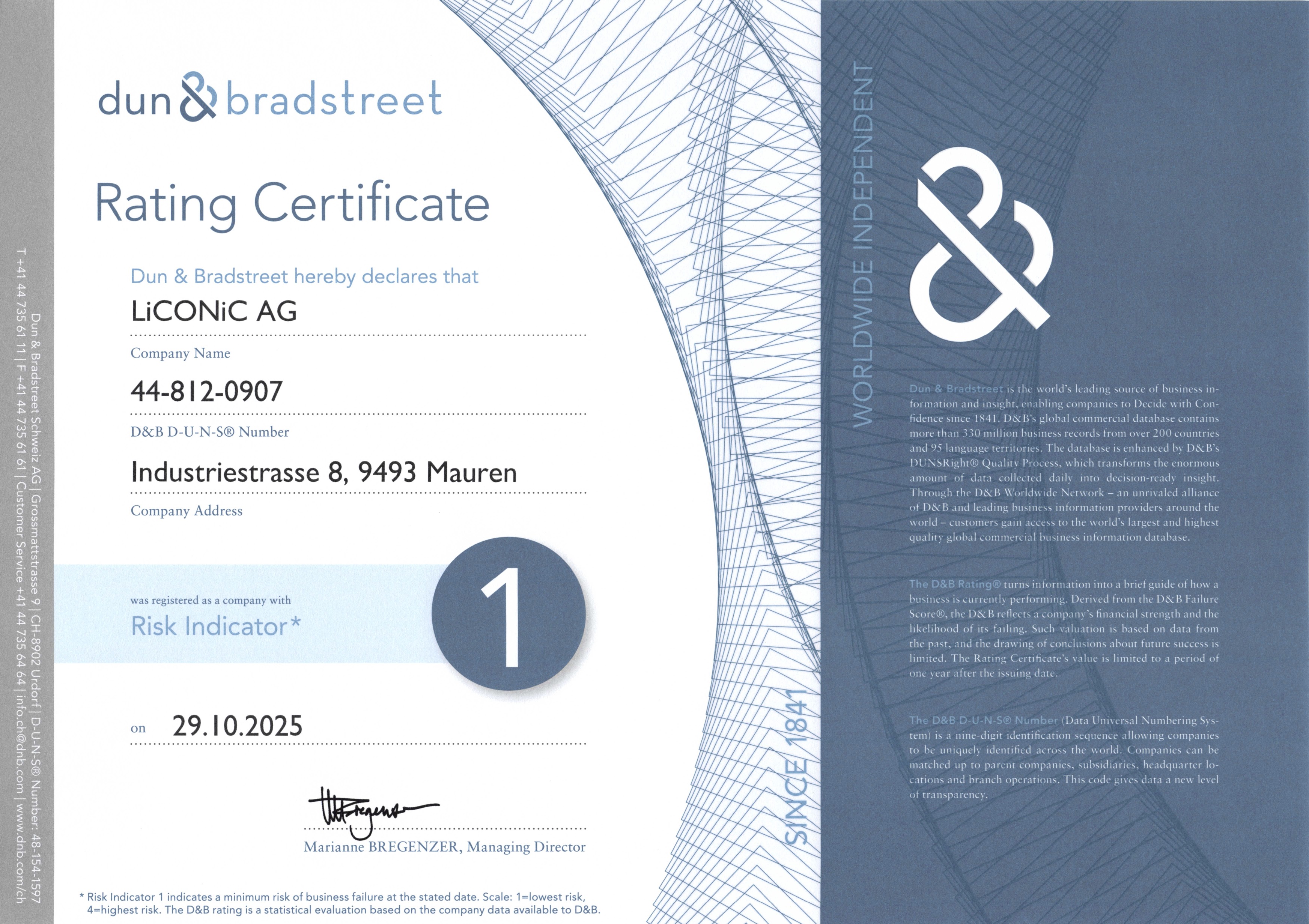 Since October 2014, LiCONiC AG has been awarded the prestigious D&B Rating Certificate,